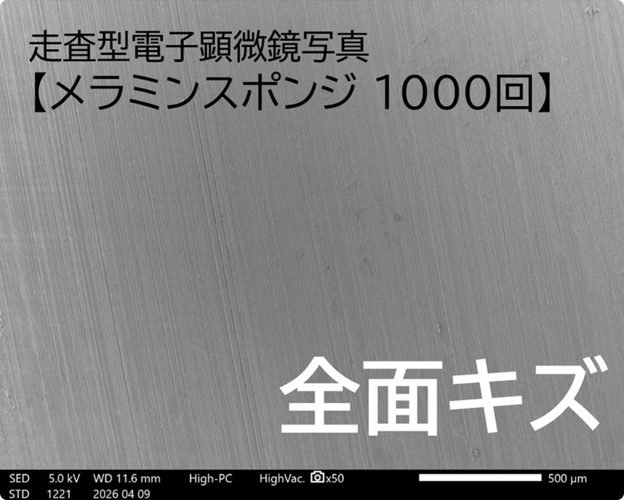 各種スポンジが素材に与えるダメージの評価試験を実施しました。 その結果、セカンドスポンジの「削らず、落とす」という特長が、極めて過酷な条件下でも実証されました。
